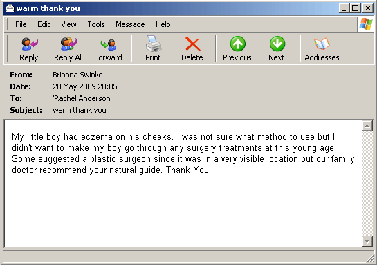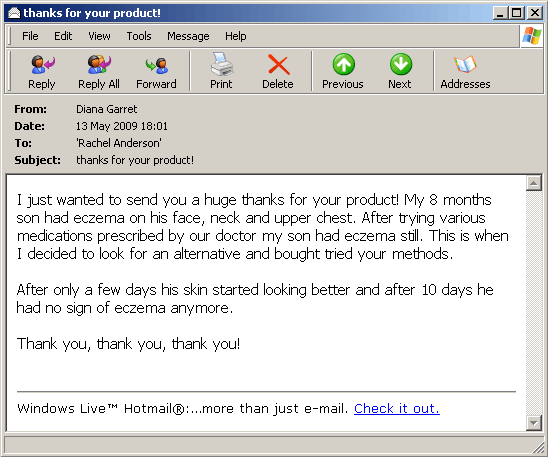 "I just wanted to send you a huge thanks for your product! My 8 months son had eczema on his face, neck and upper chest. After trying various medications prescribed by our doctor my son had eczema still. This is when I decided to look for an alternative and bought tried your methods. After only a few days his skin started looking better and after 10 days he had no sign of eczema anymore. Thank you, thank you, thank you!"