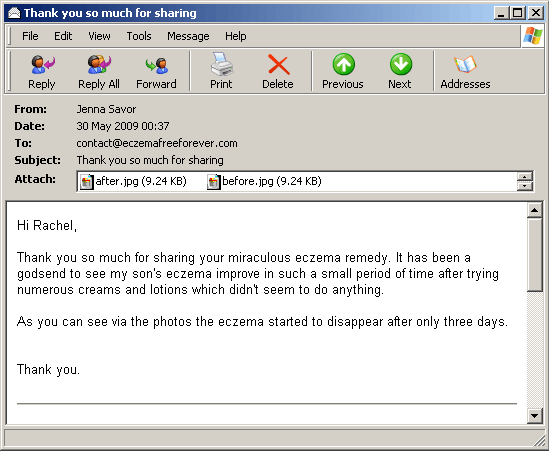 "Thank you so much for sharing your miraculous eczema remedy. It has been a godsend to see my son's eczema improve in such a small period of time after trying numerous creams and lotions which didn't seem to do anything.