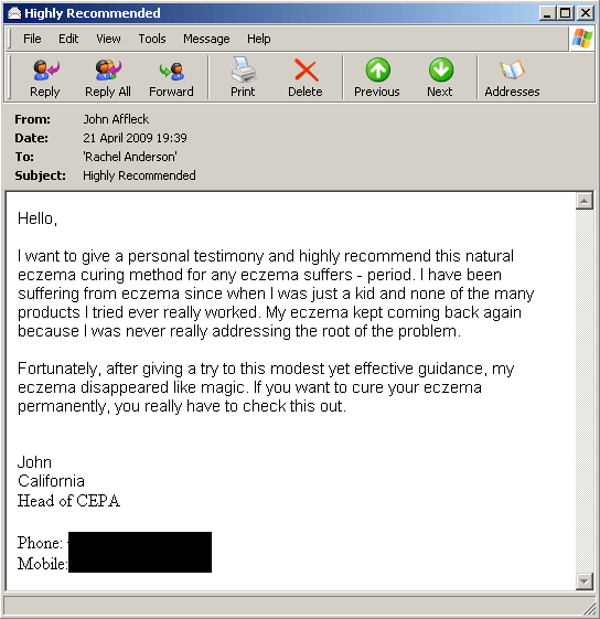 I want to give a personal testimony and highly recommend this natural eczema curing method for any eczema suffers - period. I have been suffering from eczema since when I was just a kid and none of the many products I tried ever really worked. My eczema kept coming back again because I was never really addressing the root of the problem.