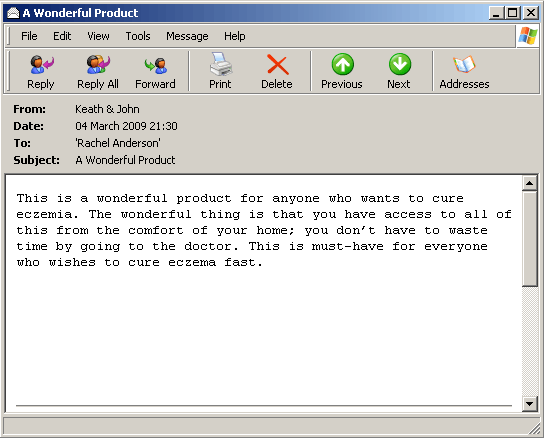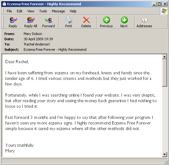 Fast forward 3 months and I'm happy to say that after following your program I haven’t seen any more eczema signs. I highly recommend Eczema Free Forever simply because it cured my eczema where all the other methods did not. Yours truthfully Mary"